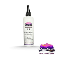 Krautcover Scenic's innovative alcohol-based fixing solution makes it possible to seal loose basing material or scattered pieces of terrain in the long term and thus prevent grit from trickling off. The innovative formulation of a non-toxic alcohol-based resin polymer enables the fixing solution to be applied deep into the gritting material without pre-treatment by prior moistening. The original colour of the spreading material is only slightly affected after drying and largely reduces the known darkening effect caused by diluted PVA glue, for example, without having to rely on toxic ingredients. Kraut-Fixer comes in a 250ml bottle with a trusty dosing tip to apply the fixative with pinpoint accuracy in a small space.